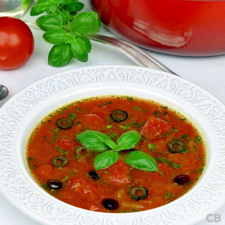 Italiaanse tomatenbouillon met oventomaatjes, olijven en basilicum
